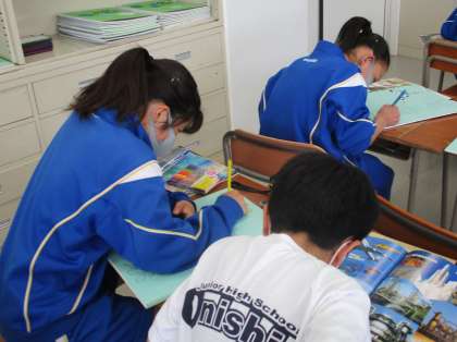 4/30(金) 1年生(美術)「文字のデザイン」 公開日 2021/05/07 更新日 2021/05/07 できごと 1年生は自分の名前をイラストとともにデザインしています。集中して作業に取り組む中で、自分自身の名前に愛着がわいてきているようです。