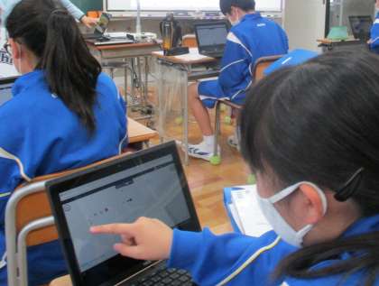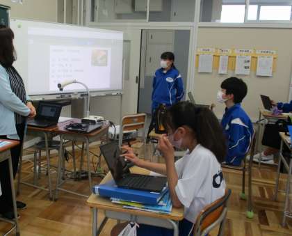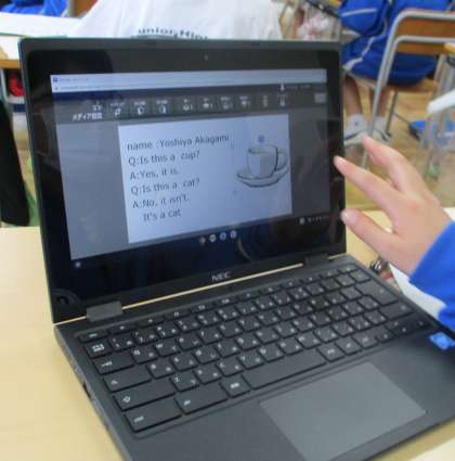 学習している英会話の定型文に、自分が選んだ単語を入れ、オクリンクで英作文カードを作成します。文章を入力した後に、ネット上からダウンロードした画像を入れて完成。みんなに送ります。代表者には前で発表してもらいました。