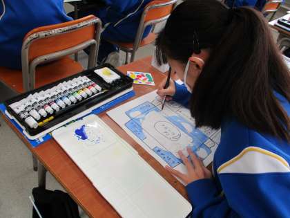オリジナルのお菓子のパッケージをデザインし、いよいよ色塗りに入りました。みな真剣に絵の具で色を塗っています。