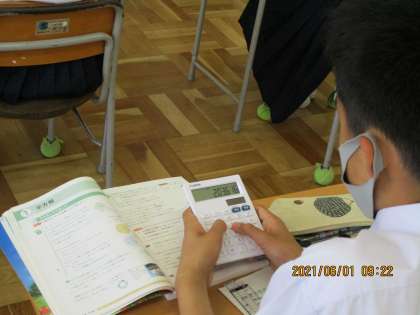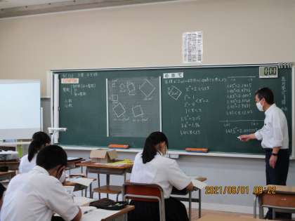 今日のめあては「面積が2になる正方形の一辺の長さを求める」ということで、生徒は計算機を使って考えます。1.414の2乗=1.999396「2まで少し足りない」、1.415の2乗=2.002225「2より大きくなってしまった」などと四苦八苦しながら無理数の存在に気付いていきます。