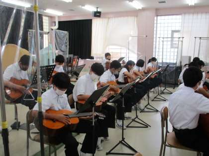 6/3(木) 3年生(音楽)「ストローク奏法で弾こう」 公開日 2021/06/03 更新日 2021/06/03 できごと 基本的なコードの押さえ方を教えてもらい、「カントリード」の演奏に挑戦。お互いに教え合う中で最初は難しかった演奏がどんどん上達し、みな楽しそうに演奏しています。