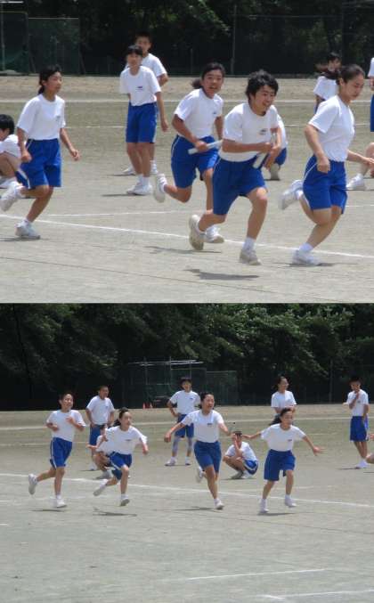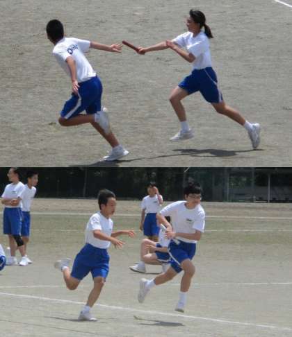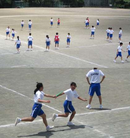 どうしたらスムーズにバトンパスができるか、グループで考えながら練習しています。できるだけ速いスピードでパスができるように工夫、見事なバトンパスが見られるようになってきました。