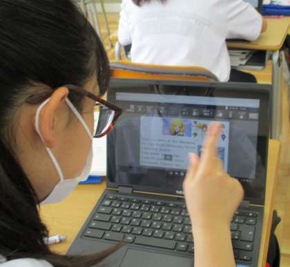 6/7(月) 1年生(英語)「自己紹介文の交流」 公開日 2021/06/07 更新日 2021/06/07 できごと 一生懸命に考えた英語の自己紹介文。仕上げをしてから、オクリンクで送り、お互いの紹介文を見合っています。ALTからアドバイスをもらっている子もいます。