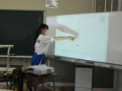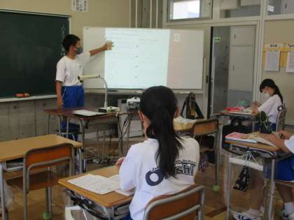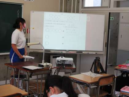 6/9(水) 1年生(数学)「文字を使った式」 公開日 2021/06/09 更新日 2021/06/09 できごと 「棒で作った正方形を5つ作るには棒は何本必要か?」図をもとにして式を考えます。一人一人の考えを実物投影機を使って説明していきます。 説明を聞いて、なるほど!!!
