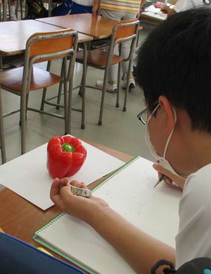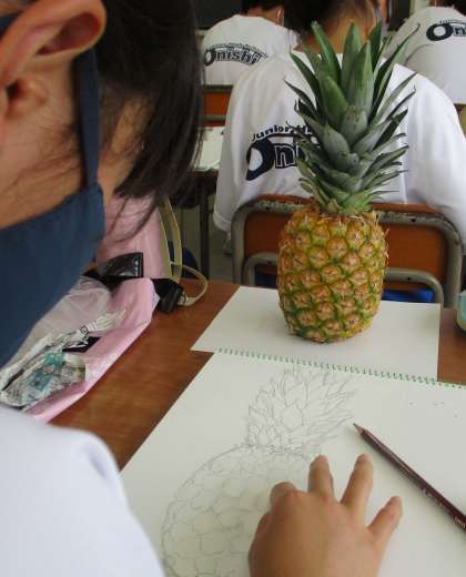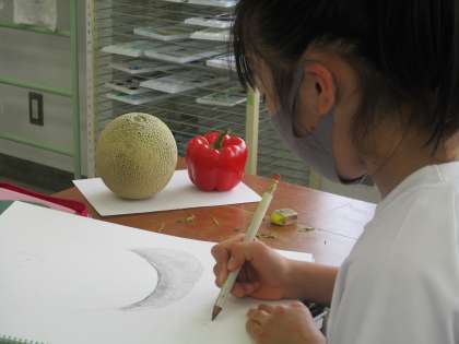 6/11(金) 1年生(美術)「果物のスケッチ」 公開日 2021/06/11 更新日 2021/06/11 できごと 家から持ってきた果物のスケッチをしています。あらゆる角度から観察し,鉛筆で濃淡をつけて特徴を捉えて丁寧に描いています。 いかに美味しさが伝わるように描けるか、かなり集中しています。