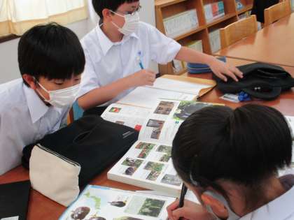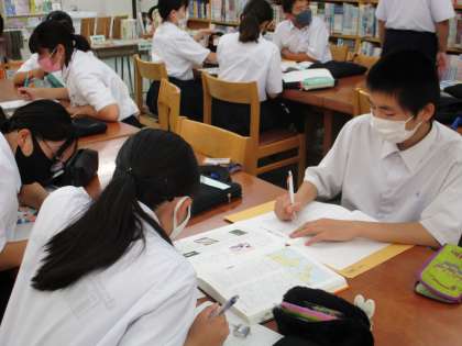 6/18(金) 1年生(国語)「情報を集めよう」 公開日 2021/06/18 更新日 2021/06/18 できごと 図書館に行き、班ごとに興味・関心のあるテーマを決めて、関係のある本を探しています。どこにどんな本があるのか・・・探し当てたら、必要な部分を抜き出しています。
