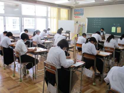 9/10(金) 3年生「第4回実力テスト」 公開日 2021/09/10 更新日 2021/09/10 Rできごと 3年生にとって4回目となる実力テストとなりました。目標に向けて努力してきた成果を発揮するため、ものすごい集中力です。