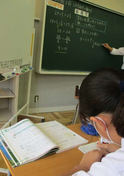 9/10(金) 1年生(数学)「等式の性質を利用して方程式を解く」 公開日 2021/09/10 更新日 2021/09/10 Rできごと 初めて方程式を解く問題に挑戦 2X+4=10 両辺に−4 2X+4ー4=10−4 2X=6 両辺を2で割る X=3 やり方が分かってきたら、繰り返し問題を解いていきます。=が縦に揃えられるようになってくれば、たいしたもの・・