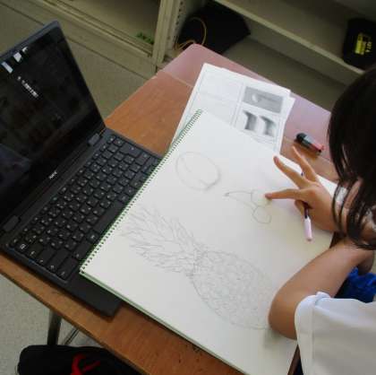 9/10(金) 1年生美術「果物のデッサン」 公開日 2021/09/10 更新日 2021/09/10 Rできごと どのように描いたら質感や量感出せるか・・・ネット上の果物の写真を参考にしながらデッサンしています。 影のつけかた一つで見え方が違ってきます。過去の作品などを参考に頑張って描いています。