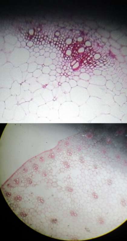 師管と道管の集まりが維管束。ホウセンカとトウモロコシの茎の断面を顕微鏡で見て違いを発見します。双子葉類では維管束は輪状に並び、単子葉類では維管束はばらばらに散らばっています。