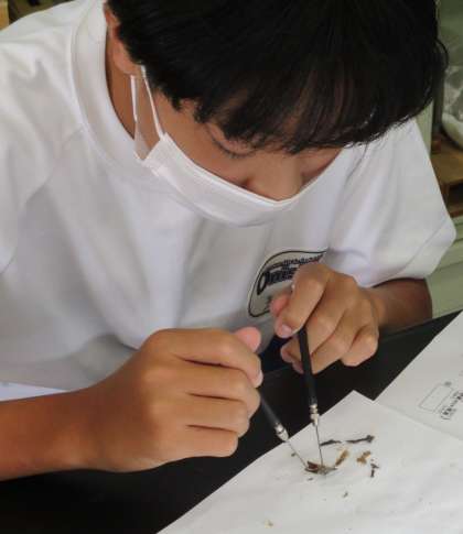 9/16(木) 3年生(理科)「カタクチイワシの胃の中身」 公開日 2021/09/16 更新日 2021/09/16 Rできごと 煮干しを解剖し、胃を取り出しました。胃の内容物を観察すると、煮干つまりカタクチイワシがどんなものを食べていたのか分かります。 消化されてしまった中に、プランクトンを発見!!プランクトンを食べた魚を食べている・・・ 食物連鎖について理解を深めました。
