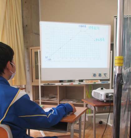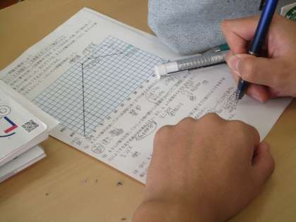 9/30(木) 2年生(数学)「一次関数の利用」 公開日 2021/10/01 更新日 2021/10/01 Rできごと 「10時に駅を出発して図書館で本を返してから、Bさんの家に行ったグラフです。図書館に行く時と、グラフから帰る時の速さを求めなさい。・・」時間、距離、速さが組み合わされた1次関数の問題です。入試問題によく使われる活用問題です。 最初は、時間がかかってもOK、丁寧に解いています。