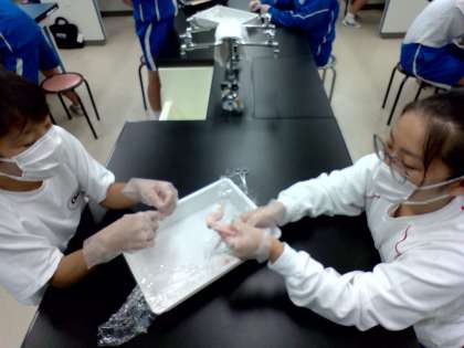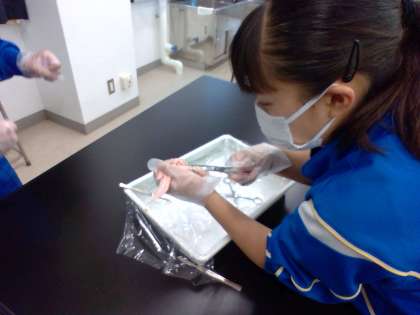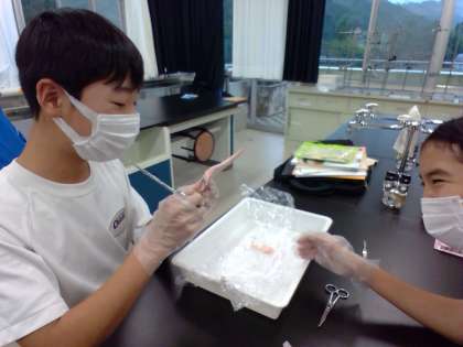 10/1(金) 2年生(理科)「骨と筋肉のしくみ」 公開日 2021/10/01 更新日 2021/10/01 Rできごと 動物の行動のしくみの学習です。骨格と筋肉のはたらきで運動をすることを学びました。実際にニワトリの手羽先で骨と筋肉のしくみを調べてみます。皮をはぎ、筋肉についているけんを引っ張って、どのように動くかを調べました。 2年
