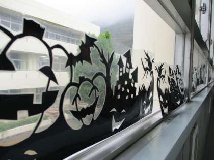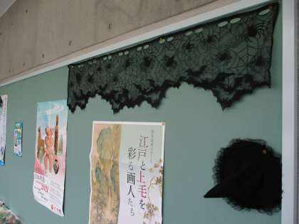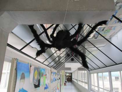 10/7(木) 美術室前の廊下で 公開日 2021/10/07 更新日 2021/10/07 Rできごと 廊下を歩いていると、何か気味の悪い物体が、、、大きな黒いクモのぬいぐるみです。どうやら、ハロウィンの飾りのようです。窓や壁面にも、すてきな飾り付けがありました。