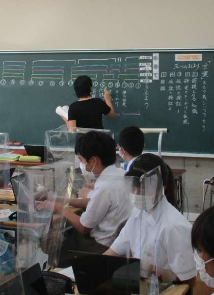 10/8(金) 1年生(国語)「段落分けを検討」 公開日 2021/10/08 更新日 2021/10/08 Rできごと 説明文「言葉をもつ鳥シジュウカラ」・・・どのように段落をまとめたら良いか? 小段落のまとまりを考え、オクリンクで送りました。5種類の考えが黒板に書かれました。教科書をよく読みながら、どの考えが正しいか・・どのような内容が書かれているか、接続詞にも着目しながら検討しています。