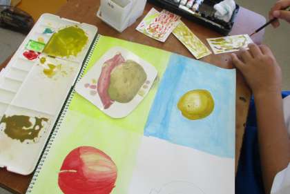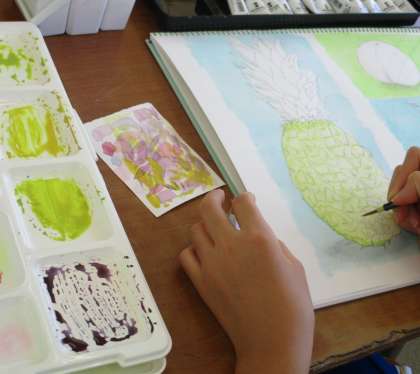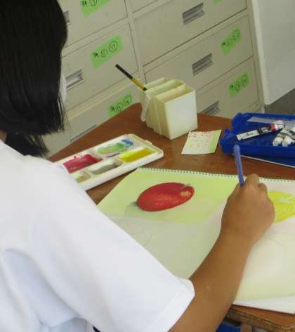 10/8(金) 1年生(美術)「三原色をもとに」 公開日 2021/10/10 更新日 2021/10/10 Rできごと どのように混ぜたら本物に近い色が出るか・・試行錯誤しながら色を作り出しています。さらに濃淡を意識しながら細かく塗っています。できあがりが楽しみです。