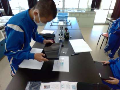 10/20(水) 3年生(理科)「イオンへのなりやすさ」 公開日 2021/10/20 更新日 2021/10/20 Rできごと 硫酸銅水溶液に銅板を入れると何も起こらず、亜鉛板を入れると板の周りに赤い物質が付着しました。亜鉛がイオンになって、その電子を銅イオンが受け取って銅になったためです。金属の種類によって、イオンへのなりやすさに差があるのでしょうか。マイクロプレートを使用して実験しました。実験結果もタブレットで保存し、次回の考察につなげます。 授業 3年