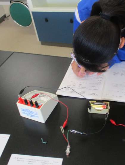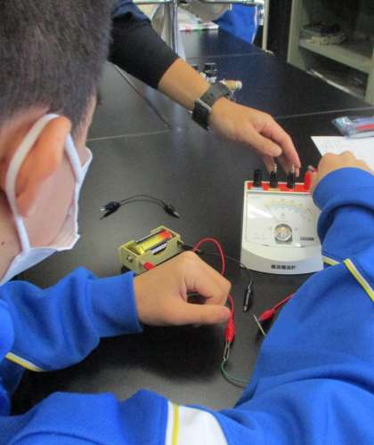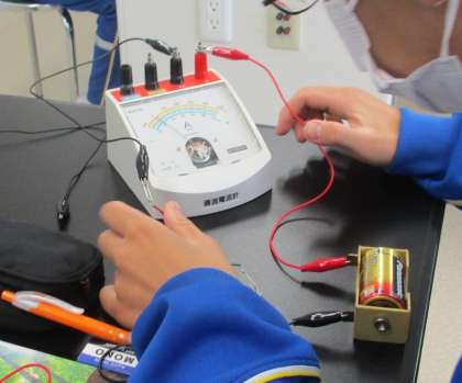 10/20(水) 2年生(理科)「電流の大きさ」 公開日 2021/10/20 更新日 2021/10/20 Rできごと 小学校では電気の電気の通り道(回路)が輪になっていると電流が流れることを学習してきました。ここでは、電流の大きさを電流計を使って測定します。 回路の中に電流計を入れ、電流の大きさを測定します。豆電球の前と後で電流がどのように変わるか?または変わらないか?