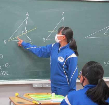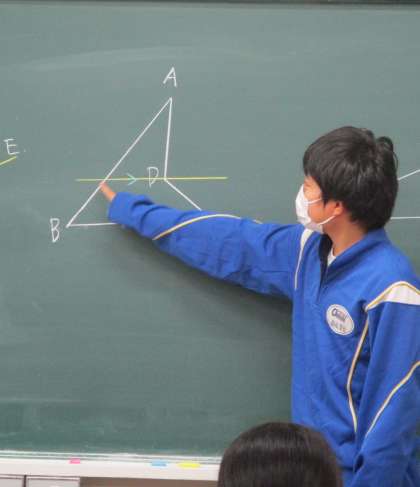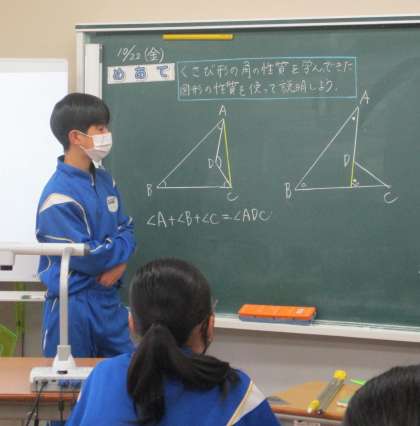 10/22(金) 2年生(数学)「角度の説明」 公開日 2021/10/22 更新日 2021/10/22 Rできごと くさび形図形の角度は、補助線の引き方によっていろいろな説明が可能です。しっかり理解するため、みんなの前で説明してもらいました。 分かりやすい説明に「なるほど」という声も・・・