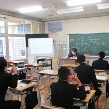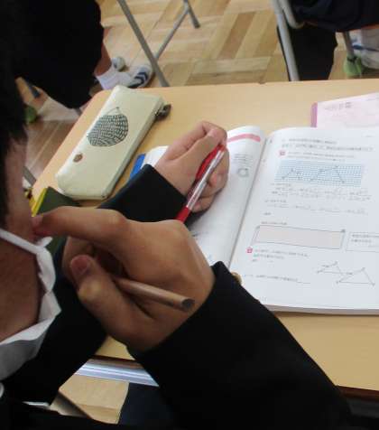 10/25(月) 3年生(数学)「相似図形の性質」 公開日 2021/10/25 更新日 2021/10/25 Rできごと 相似とは、形は同じだけど、大きさが異なる関係・・・関係を調べると次の2つの関係が分かります。 1 「対応する角の大きさはすべて等しい」 2 「対応する部分の長さの比はすべて等しい」 辺の長さを比べることにより、相似比が導き出されます。この相似比を使って、分からない辺の長さを求めることができるでしょうか?