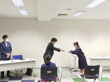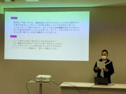 県総合教育センターで、群馬県理科研究発表会がありました。本校からは1名が代表として選ばれ、オレンジの表皮に多く含まれる成分「リモネン」についての自由研究発表を行ってきました。指導講評では、指導主事の先生から「生活の中の疑問点をテーマとし、小学校の経験から予想をたて、それを確かめる実験ができている。自分の考えをもった実験で、調べる方法についても条件を制御しながらできていた。環境問題、SDGsを考えさせられる実験だった。」とお言葉をいただきました。今回の学びを基に、来年の自由研究も頑張ってほしいと思います。