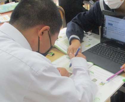 11/8(月) 2年生(英語)「リーディングテスト」 公開日 2021/11/08 更新日 2021/11/08 Rできごと タブレットを使って発音を確認しながら、教科書のUNIT全文をスムーズに読めるように練習しています。 読めるようになったらALTの先生の前で挑戦・・・なかには全文を暗記している子もいます。