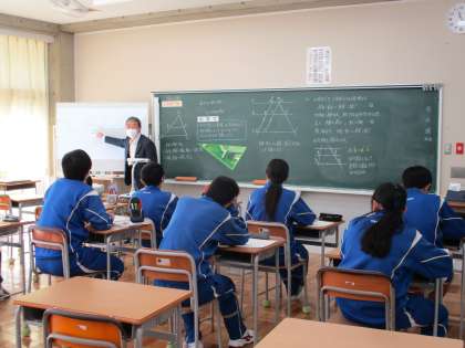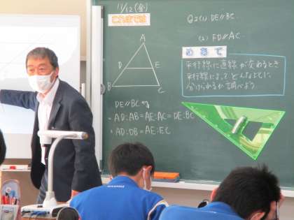 11/12(金) 3年生(数学)「平行線と角」 公開日 2021/11/12 更新日 2021/11/12 Rできごと 数学は、つながりが明確な教科です。これまでに学習した内容を生かして、今日の課題を解決していきます。 授業 3年