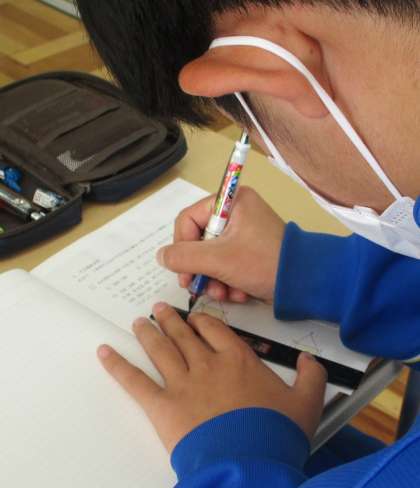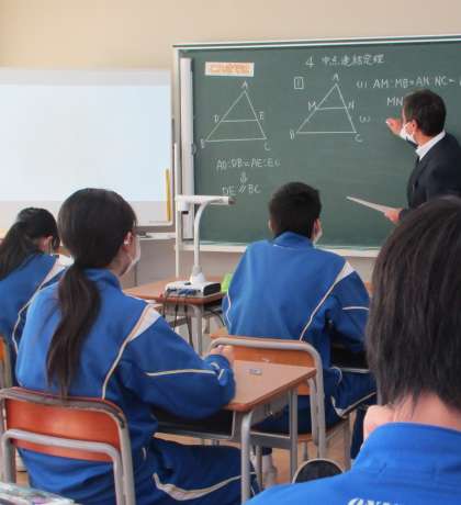 11/19(金) 3年生(数学)「中点連結定理」 公開日 2021/11/22 更新日 2021/11/22 Rできごと これまで学習してきた三角形の相似をもとにして、三角形の2辺の中点を結んでできる三角形が相似であることを利用して証明しました。 「三角形の底辺でない2つの辺の中点を結んでできた線分は、底辺と平行で、その長さは底辺の半分である。」