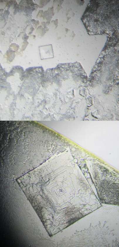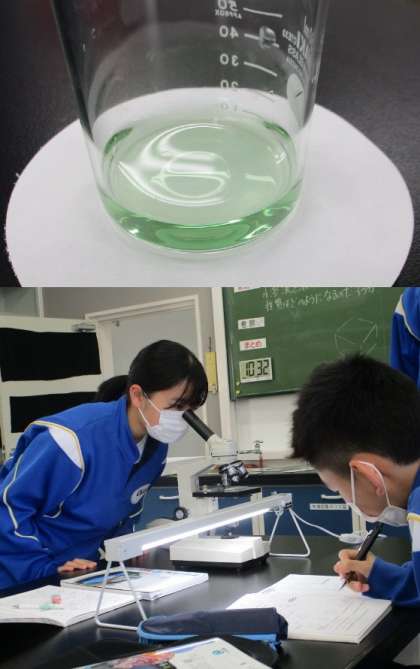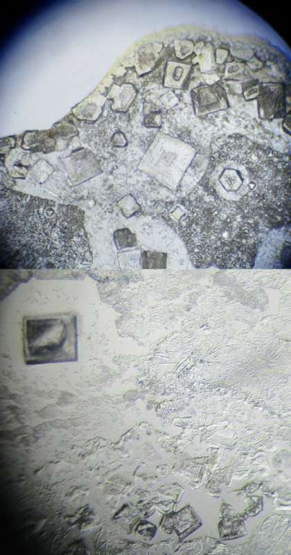 12/2(木) 3年生(理科)「中和した溶液を調べる」 公開日 2021/12/02 更新日 2021/12/02 Rできごと 塩酸HCLに水酸化ナトリウム水溶液NaOHを少しずつ入れ、BTB溶液が緑色になるまで混ぜて中性にしました。その液をスライドガラスに置いて乾燥させたものを顕微鏡で見ました。 みごとな結晶に歓声が・・・ H+ + OH- → H2O 中和して水ができるとともに Na+ + CL- → NaCl 塩ができているのです。