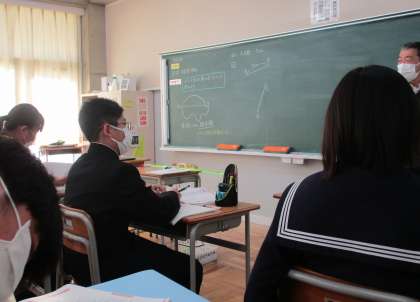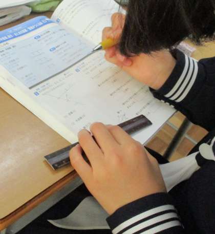 12/2(木) 1年生(数学)「北極星の見つけ方」 公開日 2021/12/02 更新日 2021/12/02 Rできごと 半直線とは,直線の一部分で,1点を端として一方にだけのびている線。 北極星を見つけるなら、北斗七星を使う方法が一番わかりやすいのですが、教科書には、カシオペア座を目安に探す問題がありました。 5つの星のうち外側の2つの星の半直線・その交点と中央の星を線分で結び、それを5倍に・・・作図しながら直線、半直線、線分についての理解が深まっていきます。