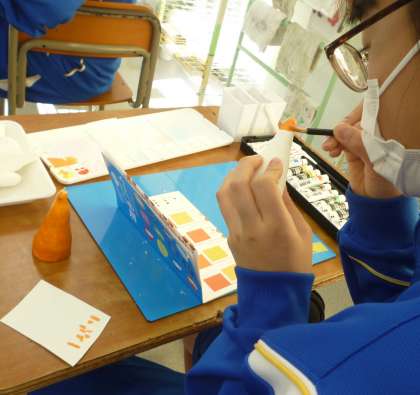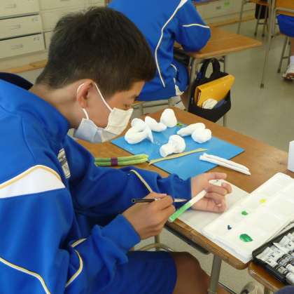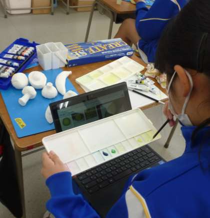 12/3(金) 1年生(美術)「野菜・果物 色塗り」 公開日 2021/12/03 更新日 2021/12/03 Rできごと 紙粘土で形を作り上げられた子から色塗りを始めています。実際の果物の色をタブレットで調べたり、絵の具を混ぜながら色を作ったり・・・一筆一筆に力が入っています。