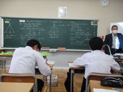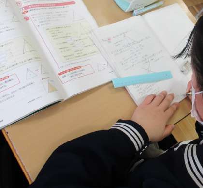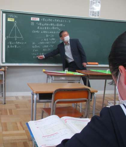12/8(水) 2年生(数学)「二等辺三角形の証明問題」 公開日 2021/12/08 更新日 2021/12/08 Rできごと 小学校では二等辺三角形は二辺が等しいことを学習してきました。ここでは、頂角の二等分線は,底辺を垂直に二等分するという性質を証明します。 2つの三角形が合同であることを証明することをもとに、垂直に交わることを明らかにします。証明問題には、流れるような説明的な文章の書き方を身につける必要があります。 教科書の文章をノートにしっかり書きながら、覚えていきます。