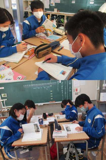 12/9(木) 2年生(国語)「君は最後の晩餐を知っているか」 公開日 2021/12/09 更新日 2021/12/09 Rできごと 序論・本論・結論 に分けた上で、本論の構造について考えます。どのように分けるか・・理由を考えた上で、グループ内で意見交換。教科書を何度も何度も読みながら構造について議論しています。キーワードや接続詞にも注目しながら繋がりを見つけていきます。 グループの代表から理由ともに発表・・・「なるほど」という声・・真剣に考えていたことが分かります。