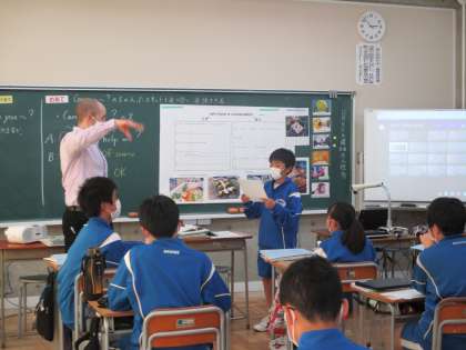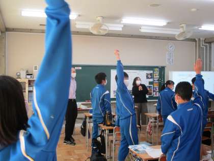 ケン先生のネイティブな発音と雰囲気作り、須藤先生の本時の課題解決のための指導、の役割分担がとてもよくできていると感じました。また、教師の発言の8割以上は英語だったのではないかと思います。生徒の耳もだいぶ慣れているようでした。生徒が、意欲的にコミュニケーション活動に取り組む姿も見られました。