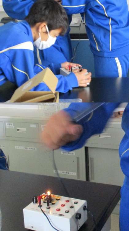 交流のしくみについて、実験装置を使って調べます。発光ダイオードは直流だと点灯する方向(+と−)が決まっており、どちらかでしか点灯しませんが、交流につなげると必ず点灯します。