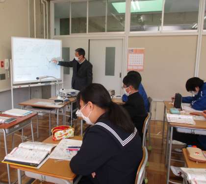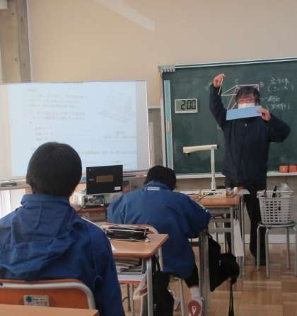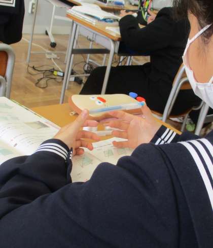 2/2(水) 1年生(数学)「平行・垂直・ねじれ」 公開日 2022/02/02 更新日 2022/02/02 Rできごと 直線と平面の位置関係について言葉では理解してきましたが、ここでは実際の空間図形においてどうなっているのか確かめます。直方体のそれぞれの辺の関係を掴むのはなかなか難しいようです。 自分の机を面として・・ペンを線として平行・垂直・ねじれの位置を確認します。