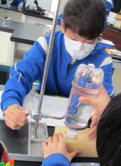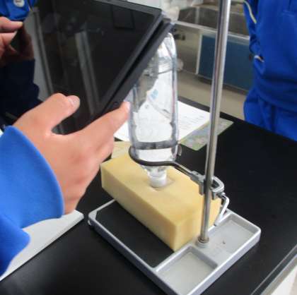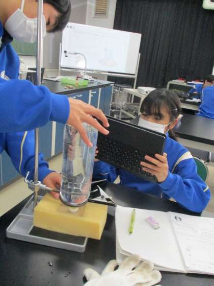 2/4(金) 2年生(理科)「圧力とは?」 公開日 2022/02/04 更新日 2022/02/04 Rできごと 1年生では、物体そのものの量が 質量で、物体にはたらく重力の大きさが 重さ であることを学習してきました。ここでは圧力について考えます。 水をたくさん入れたペットボトルを板の上に乗せます。面積が違う板を用意し、どれだけ沈むのかをタブレットで撮影します。 沈み込み方は、単位面積に関係していることに気づきます。