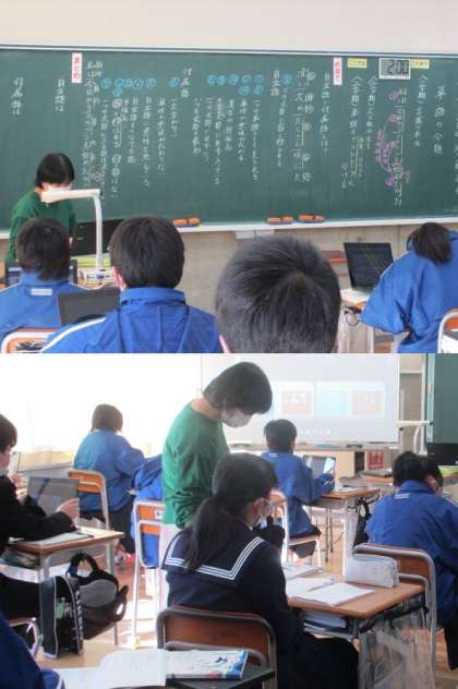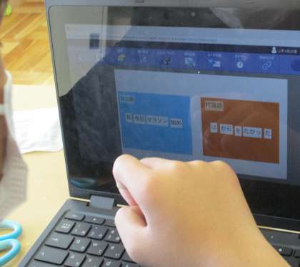 オクリンクを使って、文を自立語と付属語にどのように分けるかを操作し、これまで学習してきた自立語とは・・付属とは・・について考えています。それぞれの役割が分かったところで、問題に挑戦!