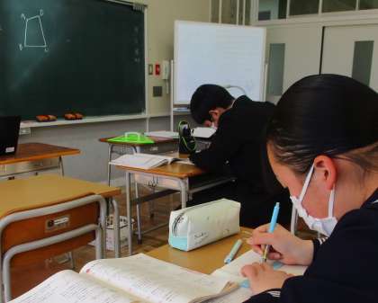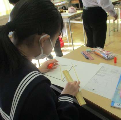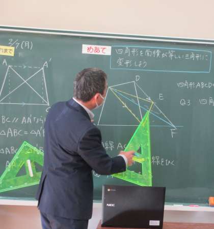 ここでは、四角形ABCDにおいて、D → E として面積が等しくなる四角形ABCEを作成する問題に挑戦しています。さらに、面積が等しくなる三角形へ・・