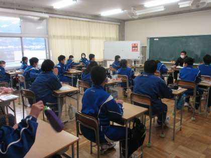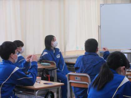 今日は1年生の学習の振り返りをしました。最初はプリントで問題を解きました。次に社会科担当からクイズ形式で問題が出され、順番に答えていきました。「ノルウェーなどに見られる氷河によってU字にけずられた谷に海水が入ってできた奥深い入り江は?」・・・「フィヨルド」と自信ありげに答えていました。