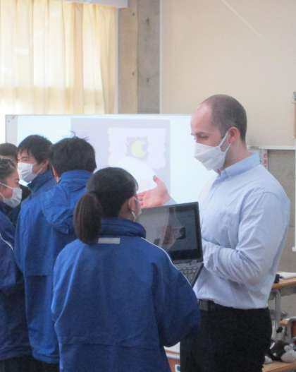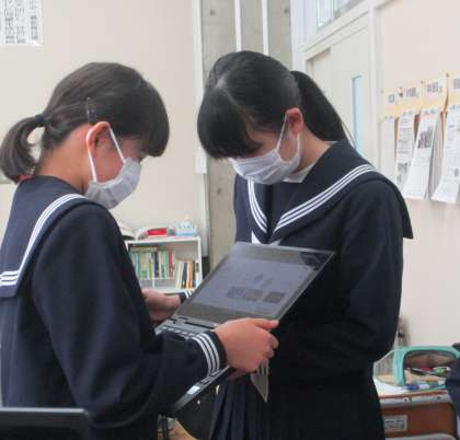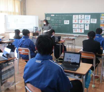 タブレットを取り出し、何かをしている画像を使って、What is he doing? のような問題を作っています。できあがったらペアで問題を出し合いっています。