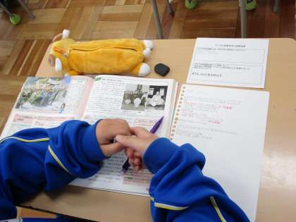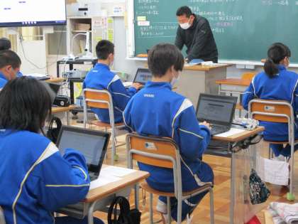 これまでの学習を踏まえて、今日はインドの民族運動について学習しました。教室を訪問したときには、インドの民族自決を進めた有名なガンディーの映像が表示されていました。単元のまとめの時間でもありましたので、「民族自決」「国際連盟」「ベルサイユ条約」の3つのキーワードを使って、アジアで民族運動が起こった背景について、生徒一人一人が、タブレットPCにまとめを入力していました。