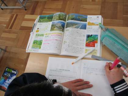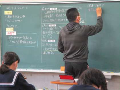 4月19日(火) 2年生(社会)「川がつくる地形と海岸や海洋の特色」 公開日 2022/04/19 更新日 2022/04/19 できごと 変化に富んだ日本の地形の特徴についての学習です。例えば、海岸線でいうと、岬と湾が入り組んだリアス海岸や長い砂浜が続く砂浜海岸などが有名です。また、多くの島から成り立つ日本は海に囲まれた島国です。日本列島の近海の海底には浅くて平らな大陸棚が広がっています。太平洋側の大陸棚の先には推進が8000mを超える海溝があります。