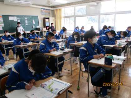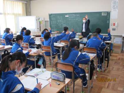 4月19日(火) 1年生(数学)「正の数負の数」 公開日 2022/04/19 更新日 2022/04/19 できごと ここでは、負の数(マイナス)について学習しています。テレビで天気予報を見ると、冬場のマイナス、前日の気温差のマイナスなど日常的に使われていることがわかります。教師の発問に、生徒は元気よく挙手していました。