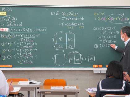 4月21日(木) 3年生(数学)「乗法公式」 公開日 2022/04/21 更新日 2022/04/21 できごと 多項式同士の乗法について、一つ一つ順番にかけていってカッコを外せばよいのですが、一定の形になっているものについては能率的に計算をすることが可能です。計算の基礎ですのでしっかり押さえておきたい内容です。