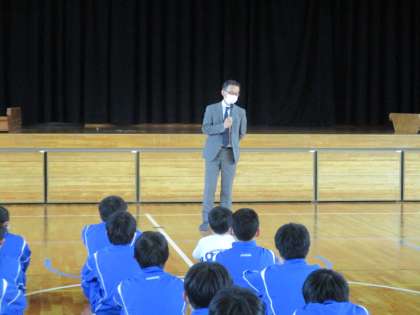 生徒会長の言葉に続いて,各チームが意気込みを発表しました。校長先生からは「一番元気にあいさつをしたり試合に臨んだりすること」「支えてくれている人たちへの感謝の気持ちをもつこと」が話されました。最後に3年生の代表からの呼びかけで「がんばろう!」と全員でかけ声をかけて締めくくりました。