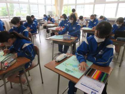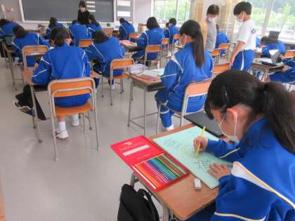 5月11日(水) 1年生美術「レタリング」 公開日 2022/05/11 更新日 2022/05/11 できごと 1年生は,真新しいスケッチブックの表紙に自分の名前をレタリングしています。仕上げに向かって色塗りです。色鉛筆やペンを使って,色を重ねたりグラデーションを付けたり工夫して,世界に一つだけの素敵な作品です。