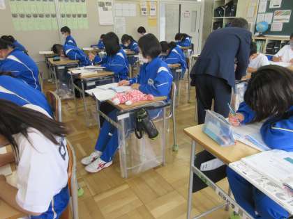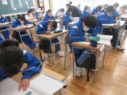 5月11日(水) 1年生数学「加法・減法」 公開日 2022/05/11 更新日 2022/05/11 できごと 1年生は,前時までに,正の数や負の数のひき算のしかたを考えて「ひく数の符号を変えて加法にして計算するといい」という規則を見つけました。それを踏まえて,今日はすらすら計算できるようになるまで練習です。黒板にはたくさんの〇がついていました。