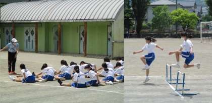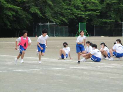 5月12日(木) 2年生(体育)「ハードル」 公開日 2022/05/12 更新日 2022/05/12 できごと 女子はハードルの練習をしました。普通に走るのと違って、障害物を飛び越えるわけですから文字通りハードルの高い競技です。クラスメイトが走るのを見て「すごいすごい!」などと拍手で励まし合いながら練習していました。 最後はリレーの練習です。各チームの応援の声が飛び交います。 今日の振り返りは、タブレットPCに入力しています。