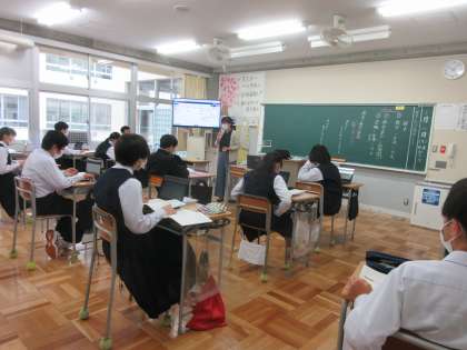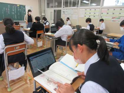 5月16日(月) 3年国語「感想を交流しよう」 公開日 2022/05/16 更新日 2022/05/16 できごと 井上ひさしの「握手」を読み進めてきた3年生は,これまでタブレットやノートにためてきた考えたことや思ったことをまとめて,互いの感想を交流し合う時間になっていました。登場人物の言動や行動を根拠に,意見を出し合っていました。